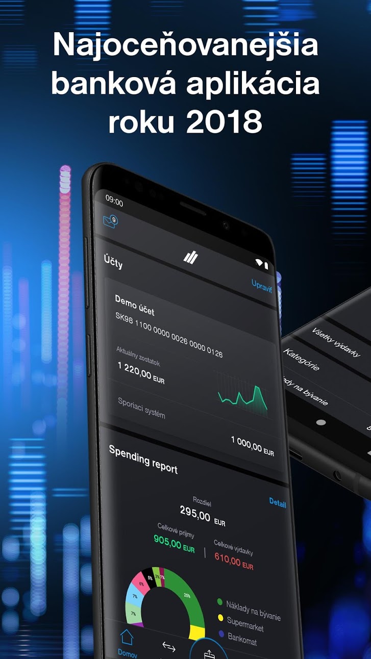 • zobrazenie zostatkov a pohybov, možnosť odpovedať na prijatú platbu, správa voliteľného prečerpania, mesačný výpis v PDF